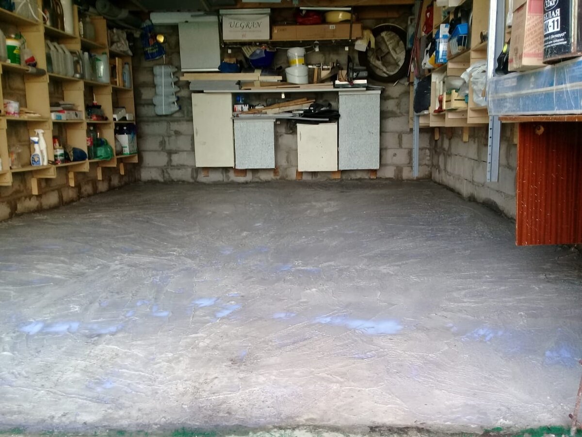 Пока у нас стояла очень жаркая погода. За +30 градусов по цельсию. Первые 5 суток ходил и увлажнял пол, чтобы равномерно просыхал бетон. Вроде как может пойти трещина при неравномерном просыхании. Но так как после ремонтов у меня оставались остатки грунтовки, то решено было смешать с водой и этим поливать. Заодно улучшить адгезию.