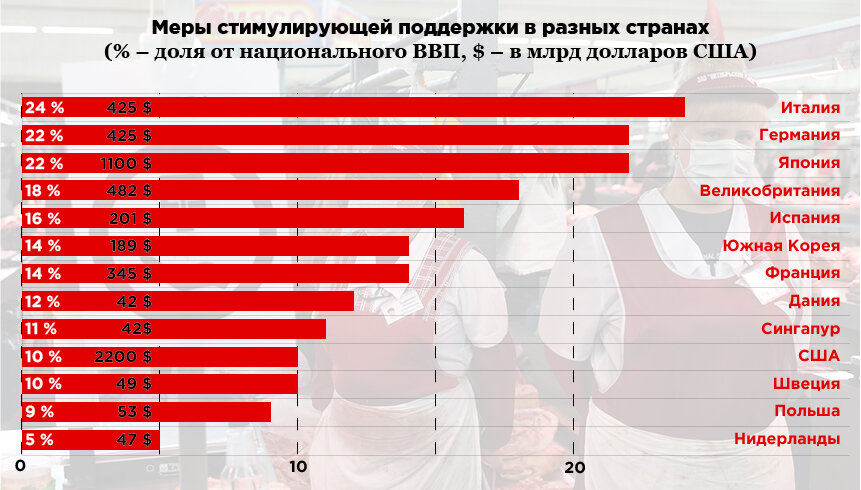 Россия потратила на компенсацию локдауна апреля — мая примерно 1,5 % ВВП и попыталась расширить кредитные механизмы поддержки предприятий и компаний малого бизнеса.