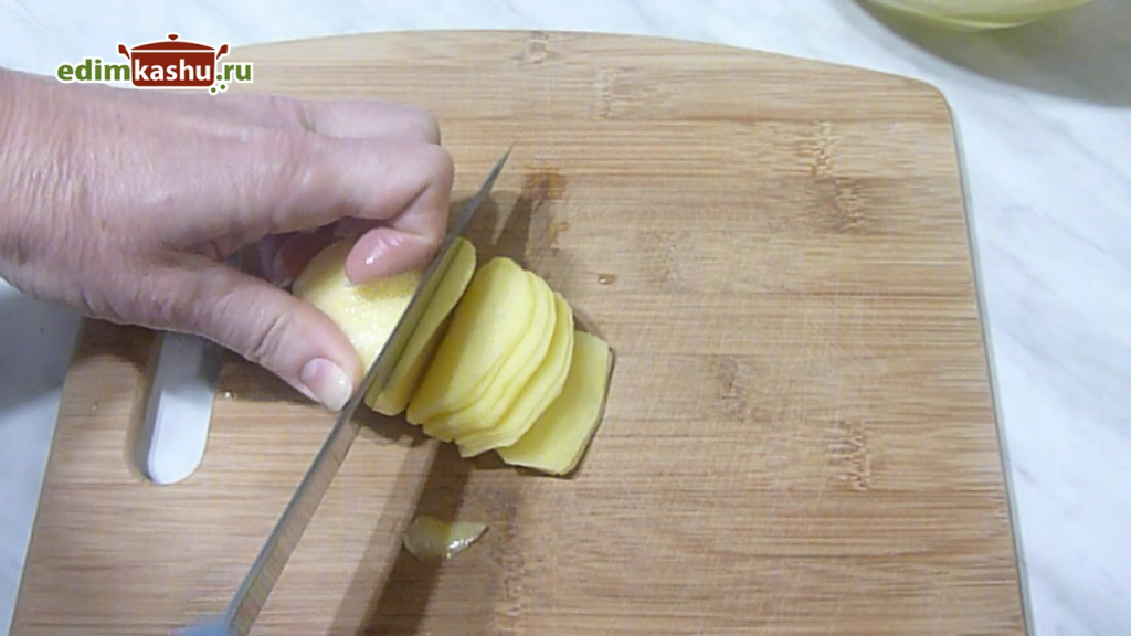 А ещё можно использовать инструмент для чистки овощей. С помощью него получаются тонкие слайсы. Я нарежу картофель двумя этими способами.