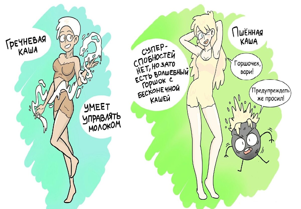 Весёлая хуманизация еды. Взгляните на обычные вещи другими глазами. Популярный художник по имени Дима Линг из Москвы изобразил обычную кашу, которую мы едим на завтрак в очень неожиданном воплощении. Каша не так проста, как казалось Что будет, если сделать из каши супергероинь, спешащих на помощь вашему аппетиту и здоровью? Линг решил немного пофантазировать, и сделал из обычного полезного завтрака привлекательных девушек, обладающих суперсилой. Каждая каша стала настоящей личностью со своим характером. Вот вам полезная и сытная гречневая каша, а вот рисовая с молоком. А если хотите, попробуйте манную с комочками, или без. Выбор большой. Всё зависит от вашего личного вкуса и ожиданий. Интересные идеи Идея с кашами оказалась очень оригинальной и яркой. Ранее никто до этого не додумался. Художник так интересно изобразил еду в виде людей, что сразу обрёл множество поклонников среди пользователь сети Интернет. Также у художника есть похожие иллюстрации с различными видами растений, которы