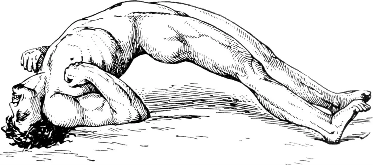 - Напряжение мышц конечностей (тонические судороги) – появляется одновременно с болью в животе, напряжены все группы мышц, кроме кистей и стоп. В связи с тем, что сила мышц разгибателей (экстензоры) выше, чем сгибателей (флексоры), пациент принимает характерную позу – голова запрокинута назад, позвоночник выгнут в поясничном отделе кзади, ноги вытянуты (опистотонус). При выраженном опистотонусе больной лежит в постели, опираясь только на пятки и затылок, остальная часть тела дугообразно приподнята. Иногда может преобладать спазм мышц живота, при котором тело больного наклоняется вперед (эмпростотонус) или вбок (плевростотонус). Такое выраженное напряжение причиняет очень интенсивную боль.