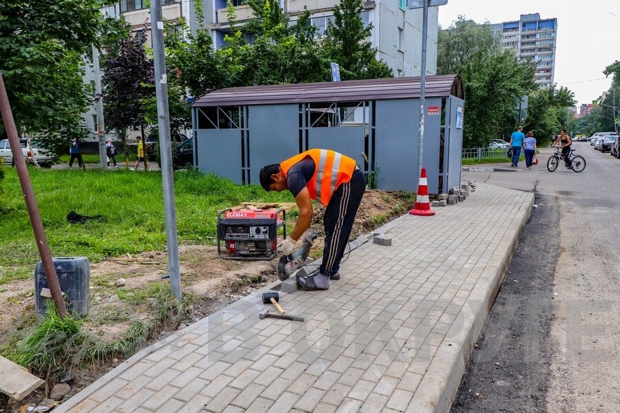 За последнюю неделю преобразился не только участок начала улицы Щербакова. Возле дома № 1, у корпуса № 2, рабочие перекладывают тротуары новой плиткой.