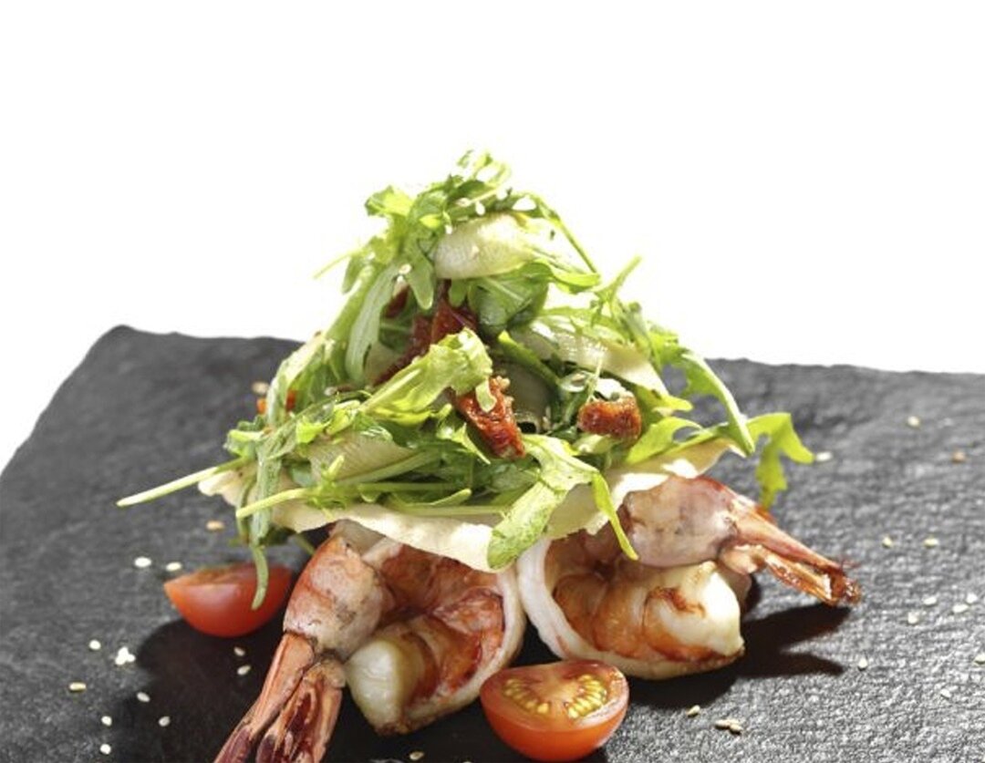 Как ни крути, руккола с креветками – это беспроигрышное сочетание. Но если к классическому салату добавить азиатские ноты, получается просто изумительно. Ингредиенты: Тигровые креветки среднего размера – 3 шт. Руккола – небольшой пучочек Помидоры черри- 2-3 шт. Дайкой свежий – несколько слайсов Вяленые томаты – 15 гр. Авокадо спелое – половина плода Рисовое тесто – 2 листа Чеснок – 2 зубчика Тимьян свежий – небольшая веточка Масло оливковое – столовая ложка Семя кунжута (обжаренное)- на кончике ножа Морская соль- на кончике ножа Перец черный – на кончике ножа Для заправки: Соевый соус- столовая ложка Рисовый уксус мицукан – чайная ложка Японское рисовое вино Мирин – чайная ложка Сахарная пудра – чайная ложка Способ приготовления: Тигровые креветки очищаем от панциря, но при этом оставляем последний сегмент, на котором держится хвост, удаляем голову и расплющиваем их со стороны спины по всей длине креветки. Солим, перчим и выкладываем на предварительно разогретой сковороде с ол