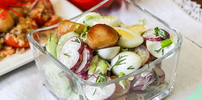Ингредиенты: Для начала размораживаем морские гребешки: перекладываем с морозильной камеры на полку холодильника на бумажное полотенце. Берем сковороду, наливаем масло и разогреваем его. Очищаем чеснок от шелухи и измельчаем его. Кладем на разогретую сковороду. Как только чеснок приобретает черный цвет, достаем его. Сделали мы это для того, чтобы масло напиталось ароматом чеснока. Далее на сковороду выкладываем гребешки. Обжариваем с каждой стороны по 2 минуты. Затем снимаем готовые гребешки со сковороды и перекладываем на тарелку. Затем отвариваем перепелиные яйца, остужаем воде и очищаем от скорлупы. Разрезаем очищенные яйца напополам. С огурца счищаем кожуру и нарезаем мелкими кружочками. Редис промываем и также нарезаем кружочками. Зелень измельчаем. Берем глубокую миску, кладем туда подготовленные овощи, солим и перемешиваем. Добавляем гребешки и перепелиные яйца, заправляем майонезом и аккуратно перемешиваем. Блюдо готово. Приятного аппетита! Источник: https://wildcr