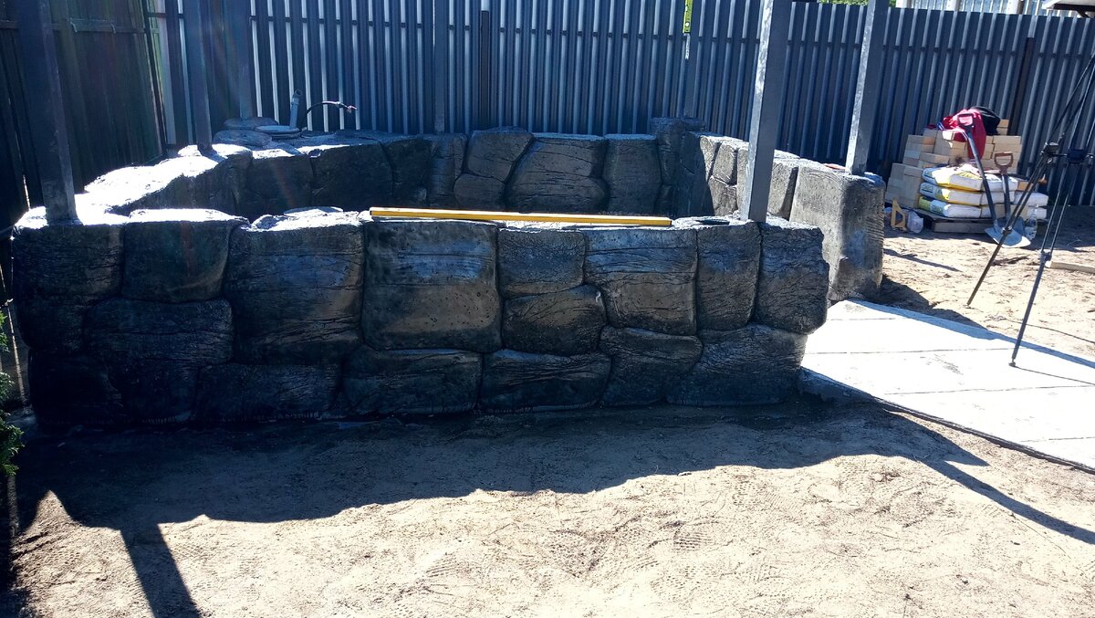 Далее мне нужно было придумать во что эту смесь формовать, чтобы не ограничивать ни размер ни форму блоков. Доступное ныне решение оказалось до безобразия простым, это плотные мусорные мешки разного объёма. Именно за счёт гладкости целлофана блоки сразу становятся глянцевыми, а после возведения стенки срезаются по шву газовой горелкой, создавая полную герметичность шва. В беседке удалось сделать 5 Полигональных блоков весом по 500!!!кг, и это не предел. Опалубка, как таковая не нужна, так как смесь имеет консистенцию глины и не создает практически никакого давления на стенки (к вопросу о том, как можно лепить стотонные блоки, без чрезмерного давления на опалубку). Ее можно использовать если только есть необходимость получить ровную стену, к примеру, как в Кориканчи. А вообще выдержит и брезент. Также можно получить дутые блоки, как внешние стороны беседки. Блоки между собой сопряжены по многомерно криволинейным поверхностям. Это достигается заранее созданными вмятинами нижнего ряда. Когда смесь засыпана в пакет её необходимо качественно отвибрировать глубинным вибратором, и вот тут происходит волшебство, смесь резонируя собственной массой выгоняет из себя воздух и цементное молочко к поверхности пакета, разводы имитируют природный камень. Формируемый блок, за счет эластичности пакета заполняет все щели, выемки и выступы соседних и нижнего блока. Сопряжение получается крепче чем у древних, за счёт большей кривизны во всех измерениях. Стенка возводится тремя рабочими и одним творческим прорабом. Им нужна одна бетономешалка и стройматериалы в шаговой доступности. Ничего тягать не надо, ведрами засыпаем смесь, вибрируем, завязываем мешок, обрезаем лишнее, гирей или булыжником сразу делаем сверху вмятину под верхний блок и можно двигаться дальше. Это гораздо проще добычи, подгонки, обработки и транспортировки природных блоков, которые по сути не намного прочнее. Есть нюанс со складками, но это тесты пакетов разной плотности, я буду рад если кто-то договорится с заводом по изготовлению пакетов любой формы и плотности и сам сделает блоки без складок.