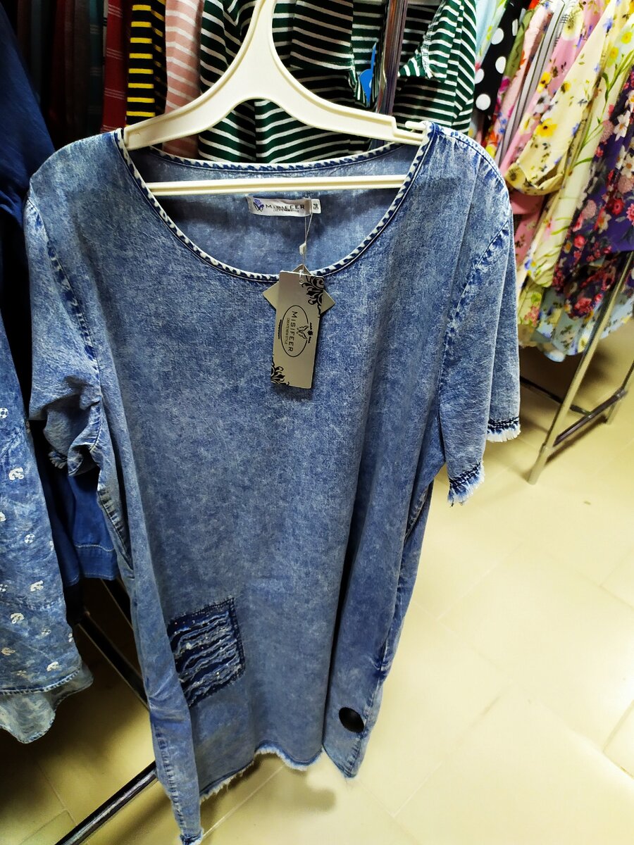 Рядом висят джинсовые юбки разных фасонов от коротких, как на этом фото до длинных. На этой юбке цена 950 рублей.
