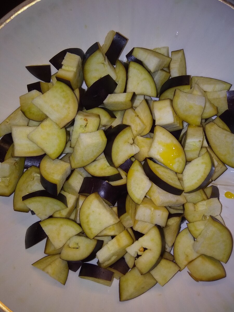 Сначала мы помоем овощи. Затем отрезать у баклажанов хвостики и нарезаем их кубиками. Шкурку можно тоже счистить, но я не стала.