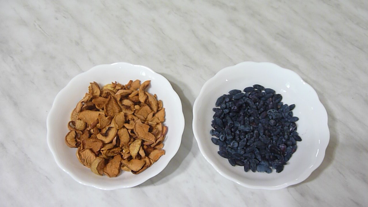 вода — 2 л Сегодня я буду варить компот из жимолости с яблоками. Мне давно хотелось попробовать жимолость. Потому что люди, которые рассказывали о ней, которые ее выращивали говорили о ее пользе, об интересном вкусе. Но сама я ее не выращивала и пробовать мне ее пока не доводилось. А в этом году наши соседи угостили нас этими ягодами, и у нас появилась мысль тоже начать их выращивать. Потому что ягоды эти вкусные. Они действительно очень полезные. И одними из первых радуют хозяев долгожданными весенними витаминами. Это самая ранняя ягода с кисло-сладким вкусом. По цвету и по вкусу жимолость немного напоминает синие сливы. Ягоды имеют интересную форму. Косточек в них нет. Для компота я взяла горсть сухих яблок. Я их взвесила. Получилось 50 грамм. Можно, конечно, использовать и свежие яблоки. Тогда их нужно взять побольше — два-три фрукта. Жимолости у меня будет сто грамм. Жимолость можно заморозить на зиму и варить с ней компот в любое время года. Ягоды и яблоки я засыпаю в двух литров