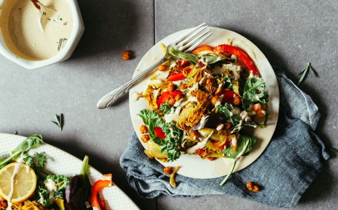 Безумно вкусный 30-минутный салат с хрустящим, нежным запеченным с карри фенхелем. Подается с красным болгарским перцем и сливочной заправкой из тахини. Добавьте хрустящий нут для дополнительного белка, клетчатки и хруста!