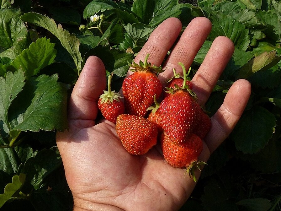 Основной клубничный сезон отошел у нас еще месяц назад. В середине июня доедали последние ягодки поздней Пандоры. Но клубничный праздник не будет заканчиваться, если у вас на грядках растут ремонтантные сорта. Из всех сортов ремонтантной клубники, которые у меня растут, самый производительный — это Шарлотта. Главное его постоянно поливать. Это непременное требование для нашего сухого и жаркого климата юго-восточной зоны Кубани. Это Краснодар чуть ли не каждую неделю топит дождями, а у нас влага в дефиците. А если вы еще будете его подкармливать раствором навоза или червичая или даже просто удобрения с равным содержанием азота, фосфора и калия, например в пропорции 20:20:20, а то и кальциевой селитры дадите, то урожай вас порадует вдвойне. Ведь ремонтантные сорта "пашут" весь сезон. Где ж им взять столько веществ для производства ягод без вашей помощи? Можно конечно бросить все на самотек, только тогда не удивляйтесь, что ягоды будут мелкие и сухие. Подкармливать не нужно много