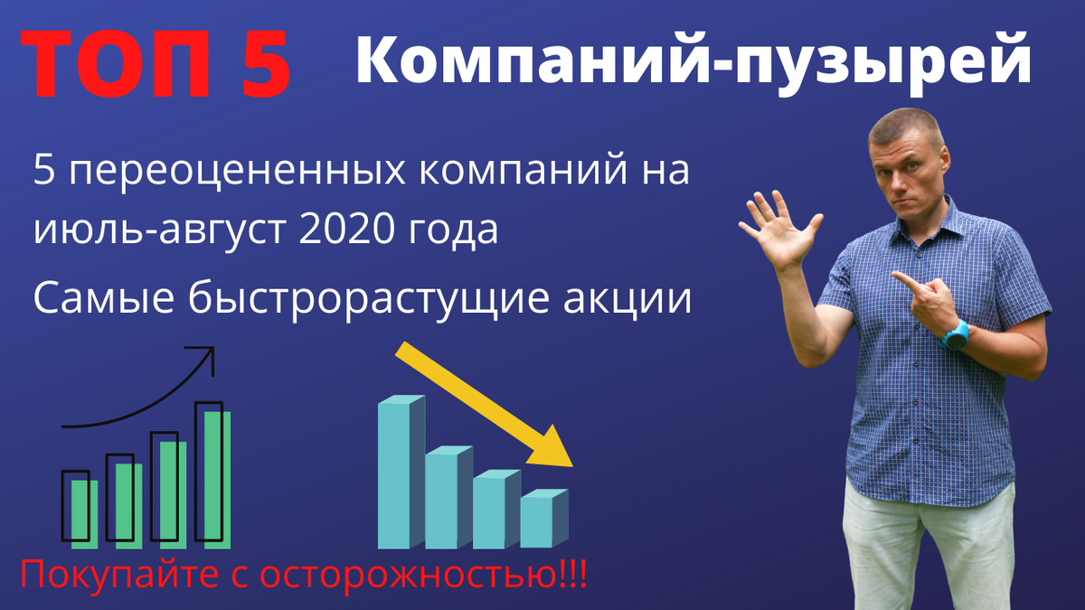 Сегодня вы узнаете про 5 американских компаний, акции которых сильно переоценены. Почти все из них показывали огромный прирост за последний год. За последний месяц они выросли еще больше. Данные акции можно сравнить с надувающимся мыльным пузырем, так как рано или поздно он должен лопнуть, но может и не лопнуть. Акции таких компаний могут как кратно увеличить ваши вложения, так и кратно их уменьшить.