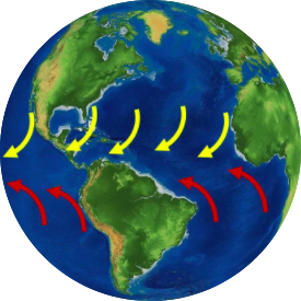 Однако не весь воздух идёт наверх: часть воздуха остаётся у поверхности и продолжает двигаться вдоль экватора, в направлении с востока на запад. Этот восточный ветер, дующий вдоль экватора, приводит в движение воду – так формируется южное и северное пассатные течения вдоль экватора.