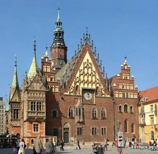 Фото и описание Ратуша – здание, построенное в стиле поздней готики, расположена на Рыночной площади Вроцлава. Ратуша является одним из наиболее хорошо сохранившихся исторических памятников Польши, важнейшим архитектурным памятником Вроцлава. Здание Ратуши строилось в несколько этапов на протяжении 250 лет с конца 13 века до 16 века. В настоящее время в Ратуше расположена мэрия, городской музей Вроцлава, а также самый старый в городе ресторан, находящийся в подвальном помещении. В 1299-1301 годах была построена основная часть здания, главным назначением которого в те времена была торговля. В 1328-1333 годах здание было расширено, добавлен верхний этаж. Это расширение продолжалось в течение всего 14-го века с присоединением дополнительных комнат, в первую очередь помещения для суда. Ратуша постепенно становилась ключевым местом коммерческих и административных функций города. В 15 и 16 века Вроцлав стал процветающим городом, что нашло свое отражение и в отделке здания Ратуши. В 1580 го