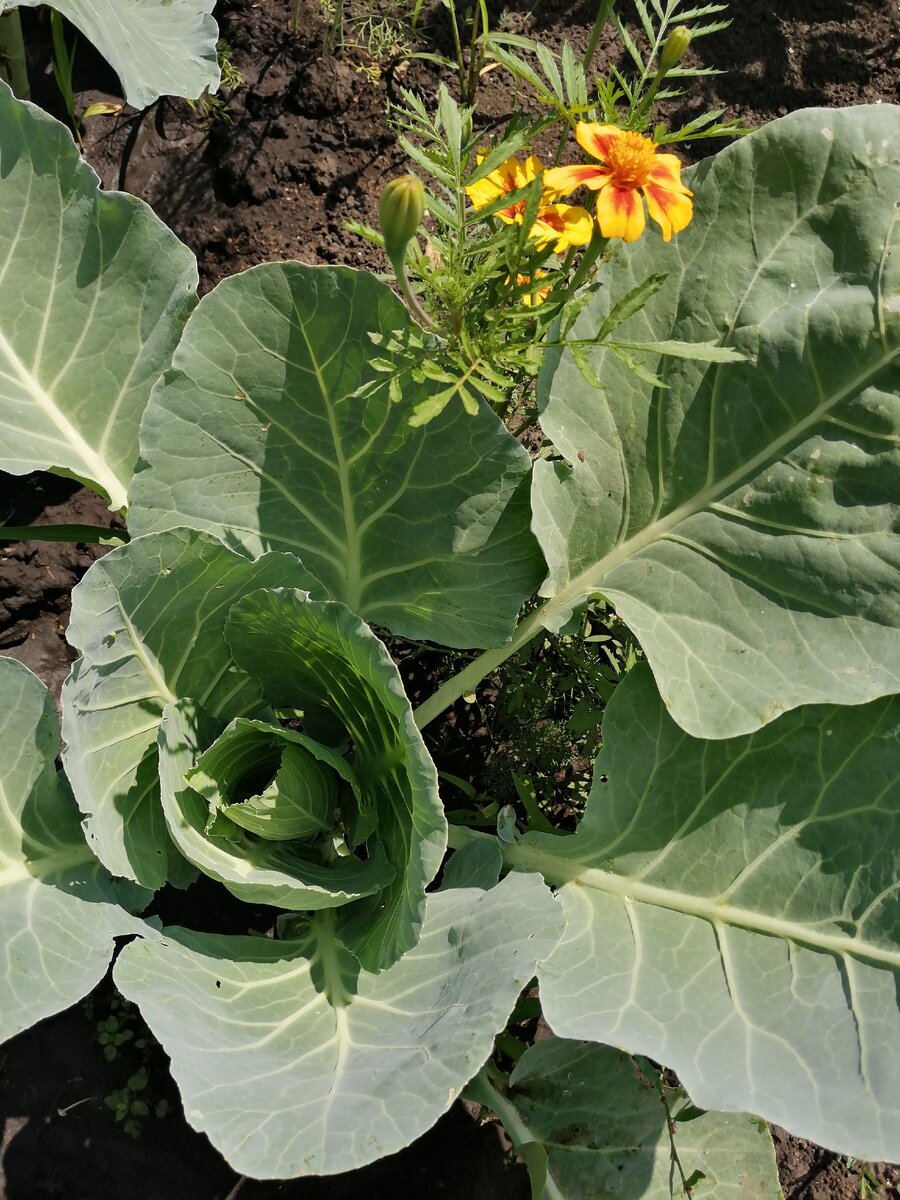 После высадки я сыпала по периметру грядки с капустой выращенный собственноручно табак. Он своим запахом маскирует капустный аромат и сбивает с толку вредителей. Этим методом пользовалась пока не подросли бархатцы. Их я выращивала рассадой и высадила рядом с капустой. Для тех же целей. Свои защитные функции цветы начинают выполнять только с началом цветения. Защита хорошая. Там, где растут цветы, капуста вредителями не тронута. На все посадки цветов не хватило, поэтому оставшиеся растения приходится защищать от посягательств гусениц и бабочек другими методами.