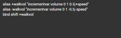 1. Бинд для увеличения звука при нажатии Shift. Этот бинд поможет вытаскивать клатчи, так как вам будет чётче слышно противника. 2. Бинд для автоматической очистке следов Если не использовать этот бинд, то возможность не увидеть соперника из-за кровавых пятен велика, поэтому вводим вот такую команду в консоль. 3. Бинд для выброса гранаты в тайминг Этот бинд поможет вам выбрасывать гранату в тайминг. Повысится правильность раскидок гранат, что помогает вашей команде победить. 4. Бинд для быстрого разворота назад Полезность этого бинда заключается в том, что вам не придётся двигать мышкой, чтобы развернуться к противнику, вам достаточно нажать на нужную клавишу и вы его убьёте. 5. Бинд для быстрого нахождения бомбы Вы можете потерять много времени при нахождение бомбы и тем самым проиграть раунд, но этот бинд поможет нам избавиться от этой проблемы. Чтобы вам не мучится писать все эти команды вручную, я вам просто их тут же напишу.Всё раставлю по цифрам: alias +walkvol "incrementvar vo