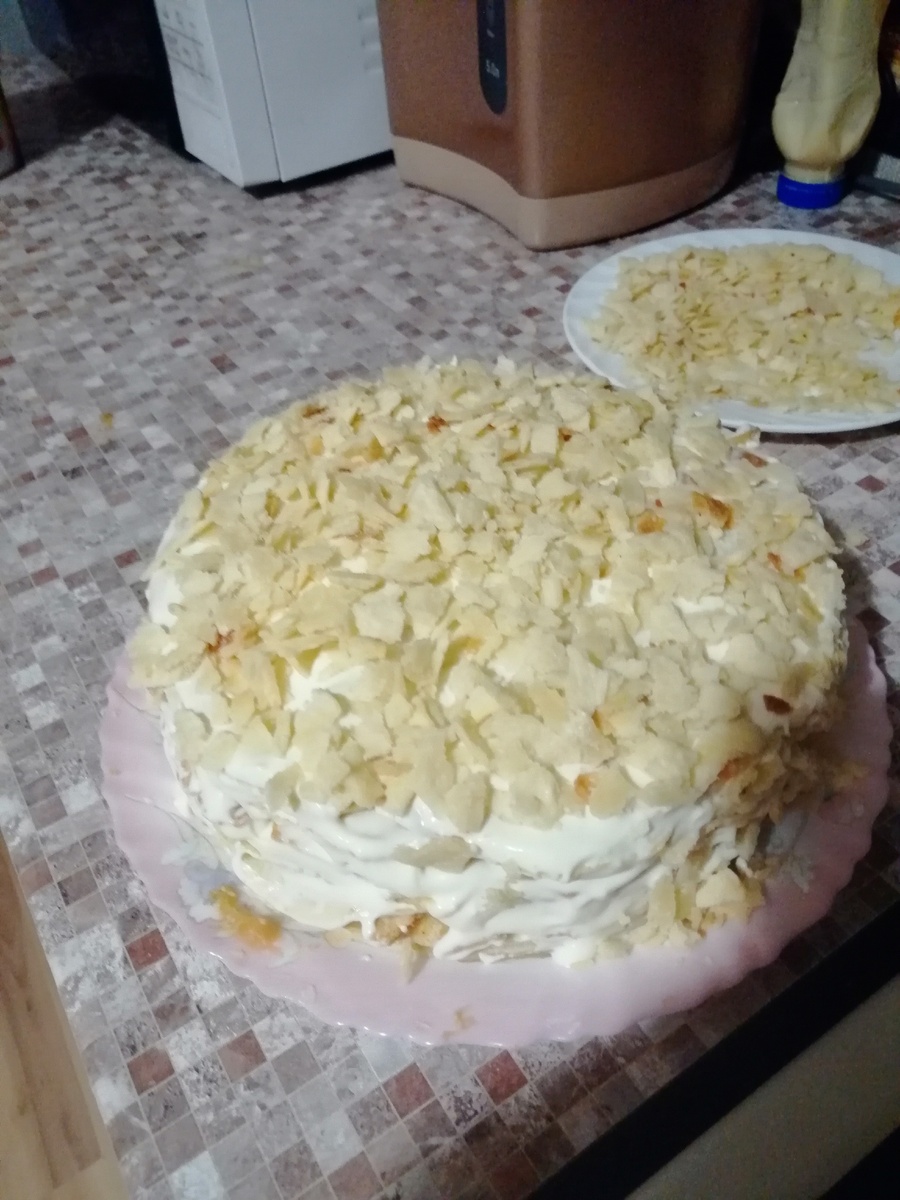 Так давно хотела научиться делать торт Наполеон, но всегда пугало его сложность. Но если я смогла это сделать, то и вы сможете. Очень вкусный и нежный. Ушёл в моей семье за один приём. Если у вас тоже большая рекомендую удвоить порцию. Ингридиенты 330гр муки 240гр сливочного масло 82.5 % 0.5 ч.л соды 130 гр. Воды Крем 3 шт желтки 25гр сахара (1) 1ст.л ванильный экстракт 60гр кукурузный крахмал 360гр.молоко 40гр.вода 90гр.сахара(2) 30гр сливочное масло 82.5% Приготовление 1. В холодной воде растворить соль 2. Холодное сливочное масло порубить на кусочки и смешать с мукой, порубить в крошку ножом или размешать миксером. (только обязательно не до полного растворения муки, надо что бы комочки были) 3. Сразу добавить воду с солью и быстро перемешать. 4. Убрать тесто в холодильник на 2,3 часа 5. Разрезать на 8-10 кусочков 6. Тонко раскать тесто и выпекать при температуре 200ГР. 5-8 минут. После вырезаем коржи кольцом 16см. Крем 1.Взбить желтки с сахаром(1)добавить крахмал, перемешать.