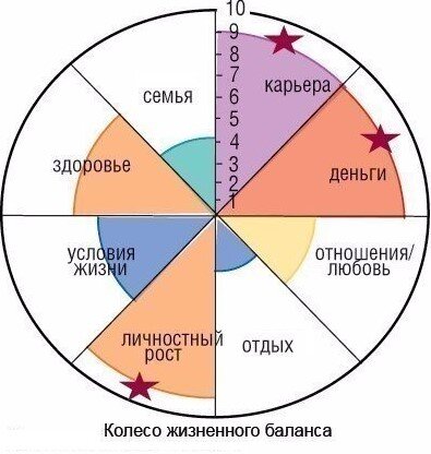 Возьмите лист бумаги и перерисуйте на него колесо с картинки к этому посту. Теперь оцените свои успехи в каждой сфере по шкале от 1 до 10. А потом соедините отметки ваших успехов линией по кругу.