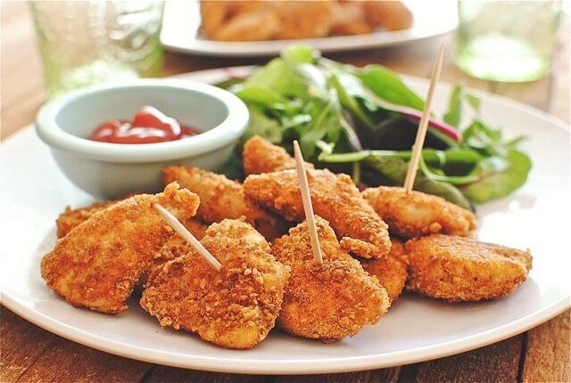 Филе грудки - 400 г 1 ст кефира 1% Овсяные отруби 40-50 г Паприка молотая Соль Специи по вкусу Промытое куриное филе нарезать нетолстыми порционными кусочками. Замариновать филе в кефире с солью и специями. Поставить в холод на 1.5-2 часа. Приготовить панировку. Для этого смешать овсяные отруби с паприкой. Обвалять кусочки мяса в овсяной панировке, выложить на противень и поставить в разогретую до 180 градусов духовку примерно на 20 минут запекаться. Подавать с томатным соусом с добавлением зелени и чеснока