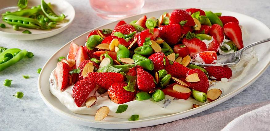 Быстрый десерт, замороженный йогурт или ангельский торт с любимыми нарезанными фруктами или ягодами.