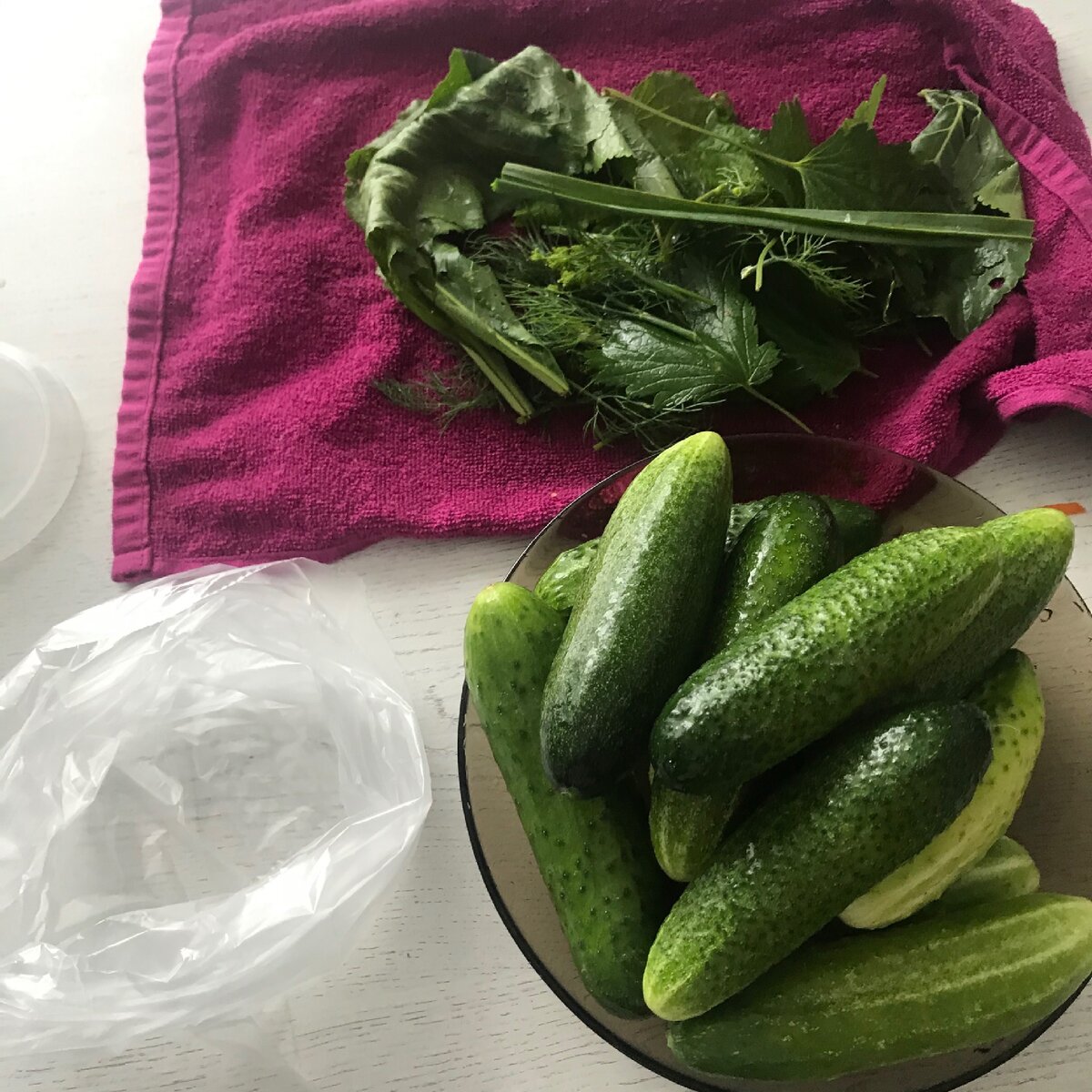 Затем добавляем туда соль, сахар, укроп, хрен, чеснок и листья смороды. Завязываем пакет , хорошо трясём и убираем на ночь в холодильник .