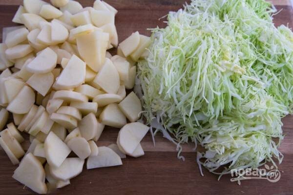 - Очищаем и моем картофель. Нарезаем его небольшими кусочками, а капусту шинкуем тонкими полосками.