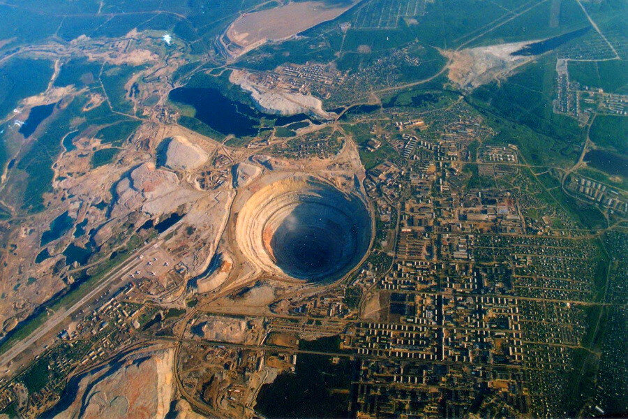 В Якутии в первозданной глубинке России расположен самый большой алмазный карьер в мире, за все годы работы которого с 1955 по 2001 годы вывезено более 350 кубометров породы.