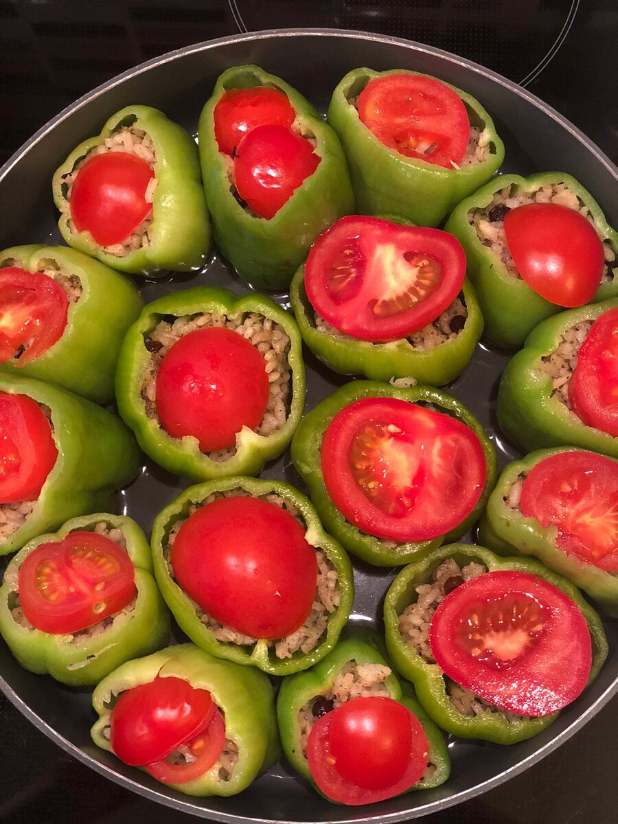 Повторюсь в очередной раз, что летом мне всегда хочется еды полегче, не такой жирной и желательно что-то из овощей. Поэтому я ищу разные рецепты в интернете, либо спрашиваю у свекрови. Она у меня замечательно готовит, так что это беспроигрышный вариант. Вот сегодня спешу поделиться с вами фаршированным перцем, но без мяса. Очень вкусно получается. Здесь вкус полностью зависит от специй, которые мы будем добавлять. Ингредиенты: Специи: Душистый перец-один из самых популярных видов на кухнях мира. Его активно используют в консервации и при приготовлении блюд. Душистый перец имеет пряный запах, жгучий вкус и напоминает смесь черного перца, гвоздики, мускатного ореха и корицы. Приготовление: Мелко нарезаем лук, добавляем оливковое масло и обжариваем на сковородке минут пять. Лука должно быть много, тогда будет намного вкуснее. Добавляем кедровые орешки и тоже немного обжариваем, 2-3 минут. Рис хорошо промываем и добавляем к луку. В это же время добавляем специальный изюм ( коринка),