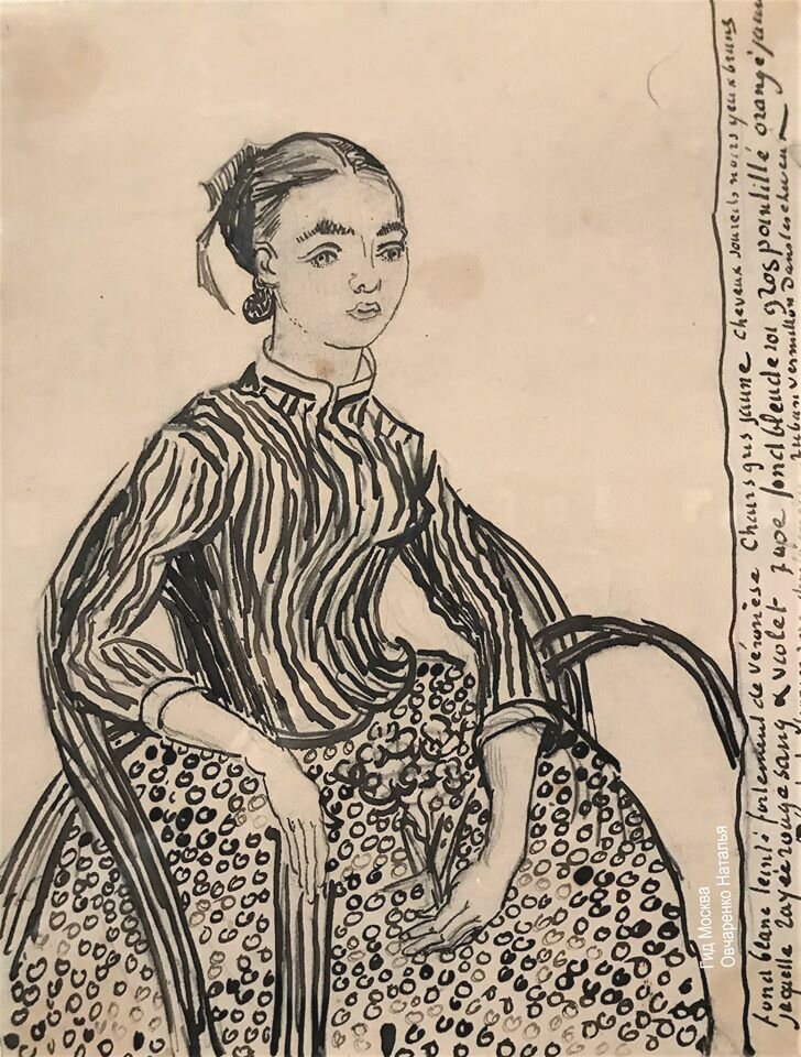 Ван Гог выполнил его со своей же картины под название «Мусме» (смотрите в комментариях я его прикрепила). Правда, не механически срисовывая, а как бы заново создавая образ. Отослал его своему другу Эмилю Бернару, что бы тот имел представление о живописной работе. Поскольку рисунок выполнен карандашом и краски отсутствуют, беглые заметки автора на полях поясняют, какие именно краски художник использовал. На рисунке как будто то убрано все лишнее, и мы видим матрицу, основу, суть. Графичные линии на кофточке девушки и цветочный орнамент юбки- это портрет прованских расчерченных длинными грядками полей и обширных некошеных лугов, их художник часто писал на своих картинах. Нежные черты лица ее прозрачны, не отвлекают внимание от образа в целом. Даже национальность, какая то международная – то ли итальянка, то ли француженка, а может быть испанка? Только из письма Ван Гога брату мы понимаем, что это девушка жительница Прованса. В своем письме брату Тео Ван - Гог писал: «Знаешь ли ты, кто та