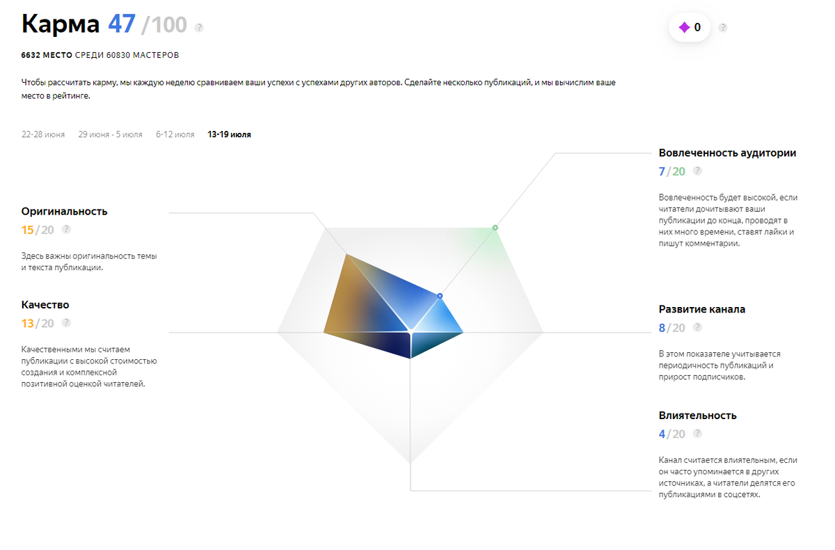 Теперь давайте про монетизацию. У меня ситуация такая, что одобрили мне достаточно быстро, началось с 2 рублей, потихоньку пошли просмотры того самого Рэпа, дошло до максимума и покатилось вниз, карма упала. Я уже было разочаровался во всем, но решил все-таки не останавливаться, выложил статью про свадьбы и это подтолкнуло людей к просмотрам, карма выросла, статистика росла вверх (если верить метрике), но деньги уже не такие, как было раньше. За месяц, кстати получилось около 1000 рублей. Много или мало - вам судить. Почему так вышло? Отвечаю.