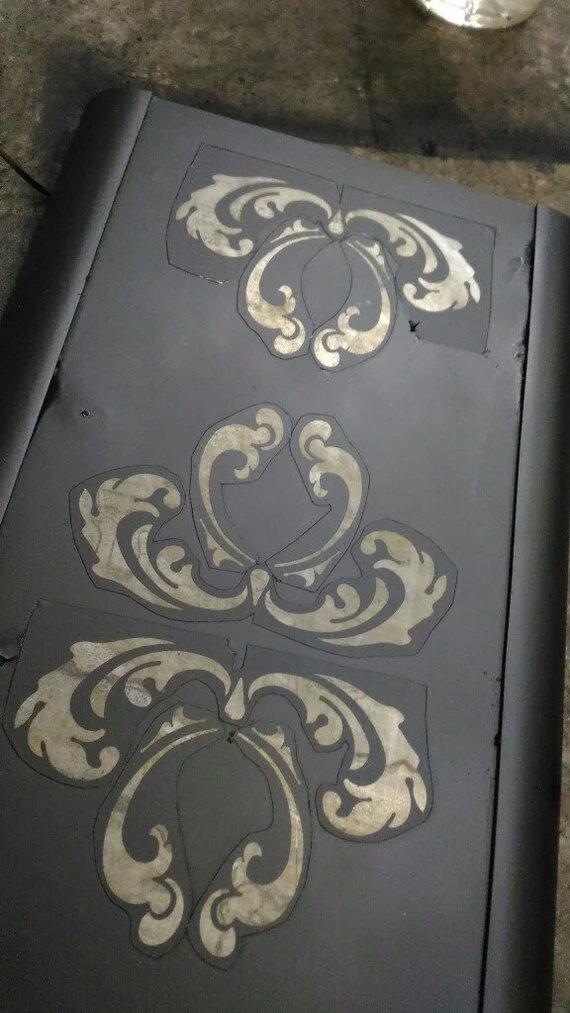 Доброе утро, сожрав остатки оливье продолжаю пост про травление. Следующий пункт - нанесение рисунка на металл. Тут есть два варианта: 1) вы умеете рисовать вручную(или не умеете, но хотите). 2) вы не умеете рисовать, но у вас есть гугл, принтер и пара листиков фотобумаги. 3) Вы немного знаете векторные редакторы и хотите протравить что-то крупное. Вторым способом я почти не пользовалась пользовалась, поэтому дам на него ссылки в комментариях. Он мне не очень нравится, поскольку слой пигмента получается тонок и при большой силе тока или при долгом травлении его отрывает. Но можно рисунок подновить уже вручную - по небольшому рельефу это сделать удобнее, чем с нуля. Третий - это сделать или иным способом добыть вектор и заказать резку самоклейки из него. И ее же и наклеить! Получатся четкие края, но что-то очень маленькое и тонкое вам из самоклейки вырезать не смогут. Вот самоклейка, подготовленная к травлению: Расскажу подробнее про первый способ. Сперва нужно подумать - а что хочет