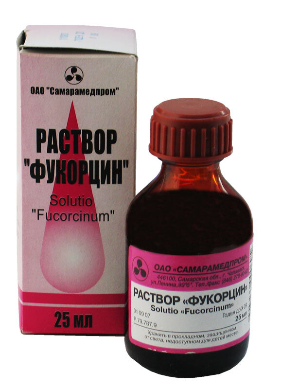 Описание препарата и особенности использования Состав средства — классический для большинства антисептиков и не имеющий лишних компонентов: здесь только борная кислота (0,8%), ацетон (4,9%), этиловый спирт и резорцинол (7,8%), а вспомогательным веществом выступает фенол, обуславливающий резкий аромат, исходящий от жидкости, красителем является фуксин. Основная направленность препарата — дезинфекция, однако набор сильный ингредиентов позволяет также ликвидировать некоторые грибки с кожных покровов. Наиболее спорным считается момент возрастного ограничения, который не прописан в инструкции по применению «Фукорцина», однако некоторые врачи, оглядываясь на фенол, рекомендуют не использовать препарат у детей младше 12 лет без особой на то необходимости. Правда, в противовес им ряд молодых родителей применяет «Фукорцин» для обработки опрелости, профилактики пиодермии и пр. у новорожденных, причем, как можно заметить из отзывов, на здоровье малыша это не сказывается. Показания к применен