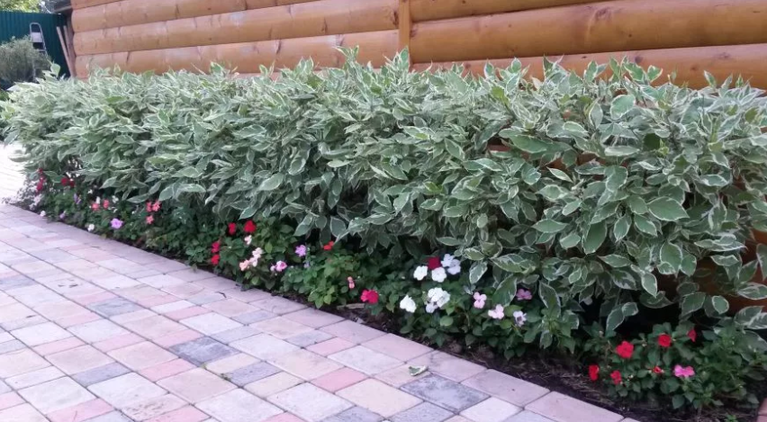 · Дерен. Неприхотливый кустарник, листочки пестрые, в летний период активно цветет, а к осени созревают плоды. При желании можно заняться стрижкой кустарника и придать ему нужную форму.