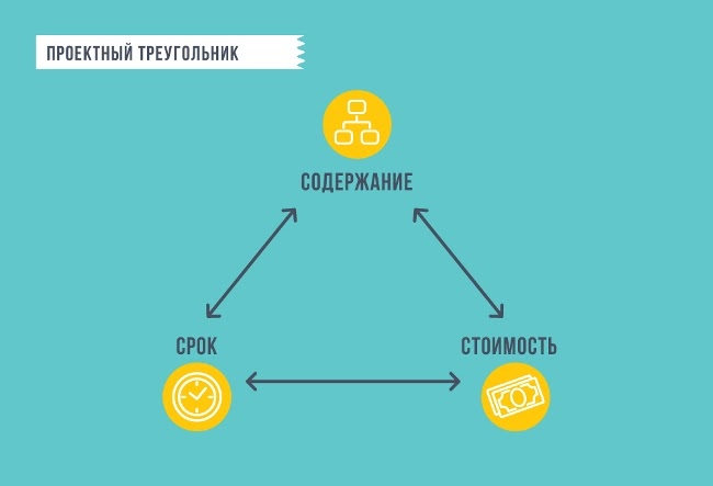 В данной модели транслируется ответственность куратора за каждый из аспектов так называемого проектного треугольника. Он отвечает за целевую составляющую проекта через реализацию запланированных задач, причём в срок и в рамках определённого бюджета.
