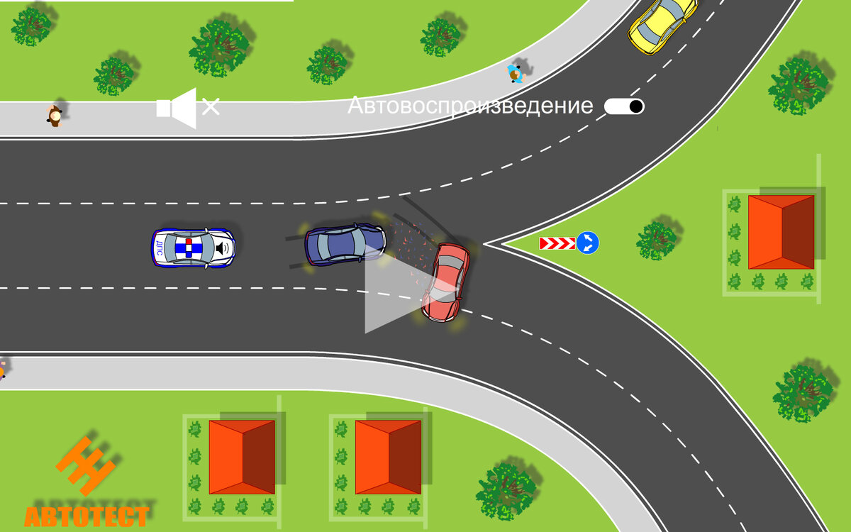 Приветствую Вас, уважаемые читатели и гости канала АвтоТест. В этом выпуске Вы увидите очередную анимацию с дорожно-транспортным происшествием. К анимацию прилагаю задачу и несколько вариантов ответов. Посмотрите внимательно на все предоставленные материалы и напишите в комментарии своё мнение о том, кто является, на Ваш взгляд, виновником аварии. Мое мнение вы увидите под роликом, а всех согласных и несогласных жду в обсуждениях. При разборе настоящего ДТП могут быть разные мнения о виновности того или иного участника аварии, а тут всего лишь картинки не имеющие отношения к реальной жизни, поэтому будьте вежливы высказывая свою точку зрения. Действия изображённые в анимации не призывают к реальным поступкам, соблюдайте правила дорожного движения. И так, поехали! Задача! На анимации мы видим дорогу с односторонним движением, которая имеет разветвление. В попутном направлении едут синий и красный автомобили. Синяя машина едет в средней полосе и намерена продолжить движение левее, а крас
