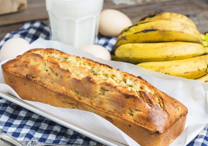 Выпечка, в составе которой есть бананы, очень нежная и ароматная. Недаром банановый хлеб набирает все большую популярность. Тем более, что бананы как таковые, давно перестали быть дефицитным продуктом. Для приготовления бананового хлеба понадобится: - мука пшеничная высшего сорта – 220 г; - сахар – 120 г; - разрыхлитель теста – 10 г; - грецкий орех – 140 г; - яйцо куриное отборное – 2 шт.; - бананы – 3 шт.; - масло растительное рафинированное – 100 мл.; - соль – ½ ч.л. Все ингредиенты должны быть комнатной температуры, поэтому лучше заранее их подготовить, выложив на кухонный стол. И перед тем как замешивать тесто, стоит сразу включить духовку, чтобы она успела прогреться до 180 C°. Итак, муку просеять через сито, чтобы дополнительно насытить ее кислородом. После чего добавить в нее разрыхлитель и соль. Перемешать все тщательно и отставить на время. Тем временем грецкие орехи обжарить на сковороде без масла 5 – 7 минут. Измельчить в блендере, либо порубить ножом до крупной крошки. В от