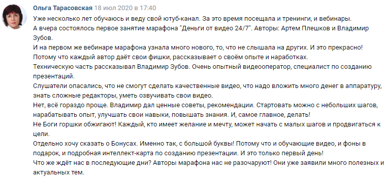 Друзья, коллеги, уважаемые эксперты! Марафон от Владимира Зубова "Деньги от Видео Презентаций 24/7" закрыт. Благодарим всех, кто принял активное участие, задавал вопросы, комментировал, писал посты и отзывы! За 5 дней Марафона отзывов было написано более 100, вот некоторые примеры: Больше отзывов вы можете прочитать здесь, а также посмотреть ниже: Контент, который получили участники Марафона, отвечал на многие их вопросы, развеивал сомнения, добавлял веры в себя и свои возможности. Смотрите примеры того, что узнали люди: Некоторые участники в последний, 5ый день прямо во время эфира создавали свои первые видео-презентации. Вот 2 примера: А вот какую продающую видео презентацию для Инстаграм, сделал наш эксперт и автор - Владимир Зубов: Это видео он сделал прямо на вебинаре за 20 минут, на глазах у зрителей. Согласитесь, повезло тем, кто был на нашем марафоне «Деньги от видео презентаций 24/7» Еще раз большое спасибо всем за активность!