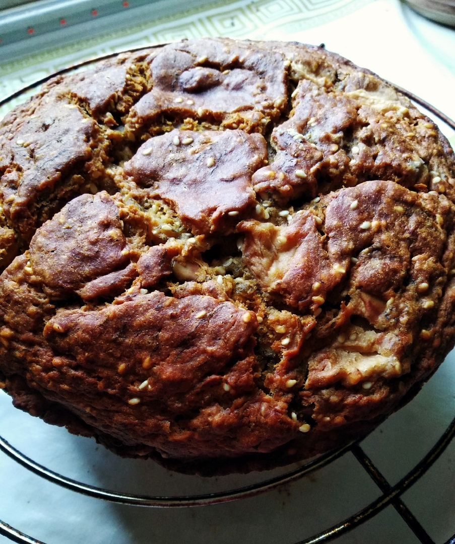 Очередная попытка сделать десерт более полезным удалась. Сегодня испекла кекс с бананами, яблоками, изюмом и кунжутом. Благодаря обилию фруктов не потребоволось большого количества подсластителя. Для теста я размяла вилкой два небольших спелых банана, добавила в них соль на кончике ножа, 120 граммов сыворотки - полстакана (её можно заменить кефиром или подкисленной водой), масло сливочное 50 гр (можно взять 2-3 ложки растительного), мёд 2 столовых ложки, соду - неполную чайную ложку. Всё смешала. Затем порезала небольшими кусочками яблоко, добавила 2 ложки изюма и столовую ложку кунжута, и наконец высыпала стакан муки - пшеничной второго сорта с отрубями. О муке моя статья здесь. Выпекала кекс при температуре 180 градусов около получаса. Корочка получилась хрустящей, а внутри тесто мягкое и довольно влажное. Семье вкус понравился. Надеюсь, понравится и вам. Приятной и полезной трапезы. дорогие читатели!