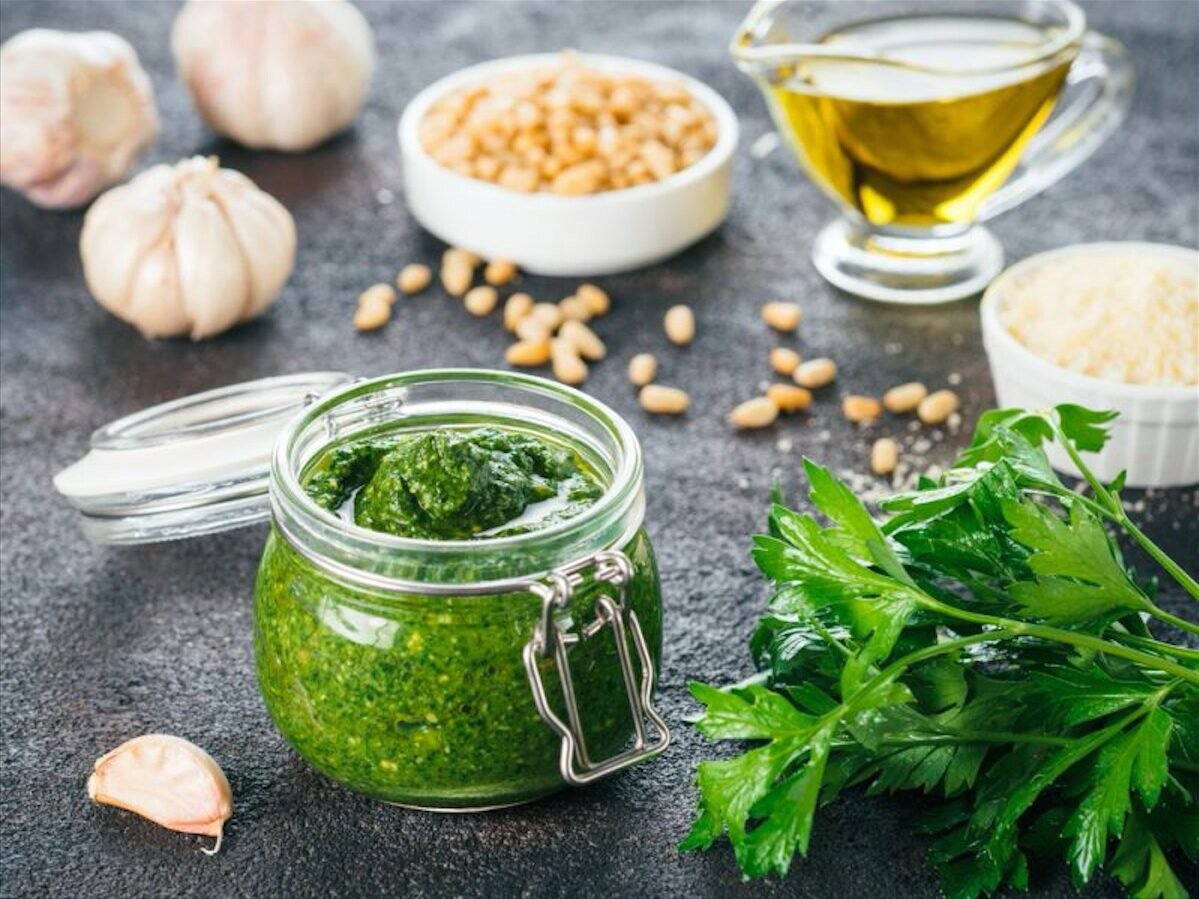 1/2 зубчик чеснока 1 ст.л. кедровых орехов 1 ст.л. тертого пармезана 25 г свежих листьев базилика 30 мл (2 ст.л.) оливкового масла Сок лимона (по желанию) Соль и свежемолотый перец по вкусу Поместите все ингредиенты в измельчитель (блендер) в порядке, как указанно выше. Зафиксируйте крышку измельчителя и на средней скорости измельчайте около 20 секунд или до тех пор, пока соус не достигнет однородной консистенции. Если соус слишком сухой, добавьте немного оливкового масла и снова взбейте. Примечание: Песто хранится до 10 дней в холодильнике.