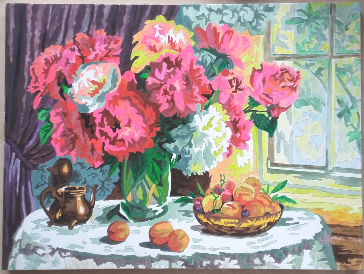 Чтобы создавать красивые картины, достаточно быть художником в душе, любить красоту, которая нас окружает: в природе, в человеке, в предметах, во всем, что находится вокруг. Необъяснимое внутреннее желание – создать картину своими руками- появилось совершенно случайно. Сейчас объясню. Прогуливаясь в выходной день по супермаркету, никуда не торопясь и подолгу задерживая свой взгляд на полках, мое внимание вдруг привлек стеллаж с детскими настольными играми, а именно: там лежали натянутые на подрамники заготовки для будущих картин с наборами красок и кисточкой. На заготовке в тонких линиях нанесен некий рисунок- основа будущей картины и к заготовке приложена маленькая этикеточка на которой изображена будущая картина в цвете. Сюжеты были разные от совсем простых изображений цветов или животных до красивых живописных натюрмортов. Мне очень понравился сюжет с букетом пионов. Постояв в раздумье некоторое время я всё-таки ушла из магазина без этой покупки. Но мысль о ней буквально не ост