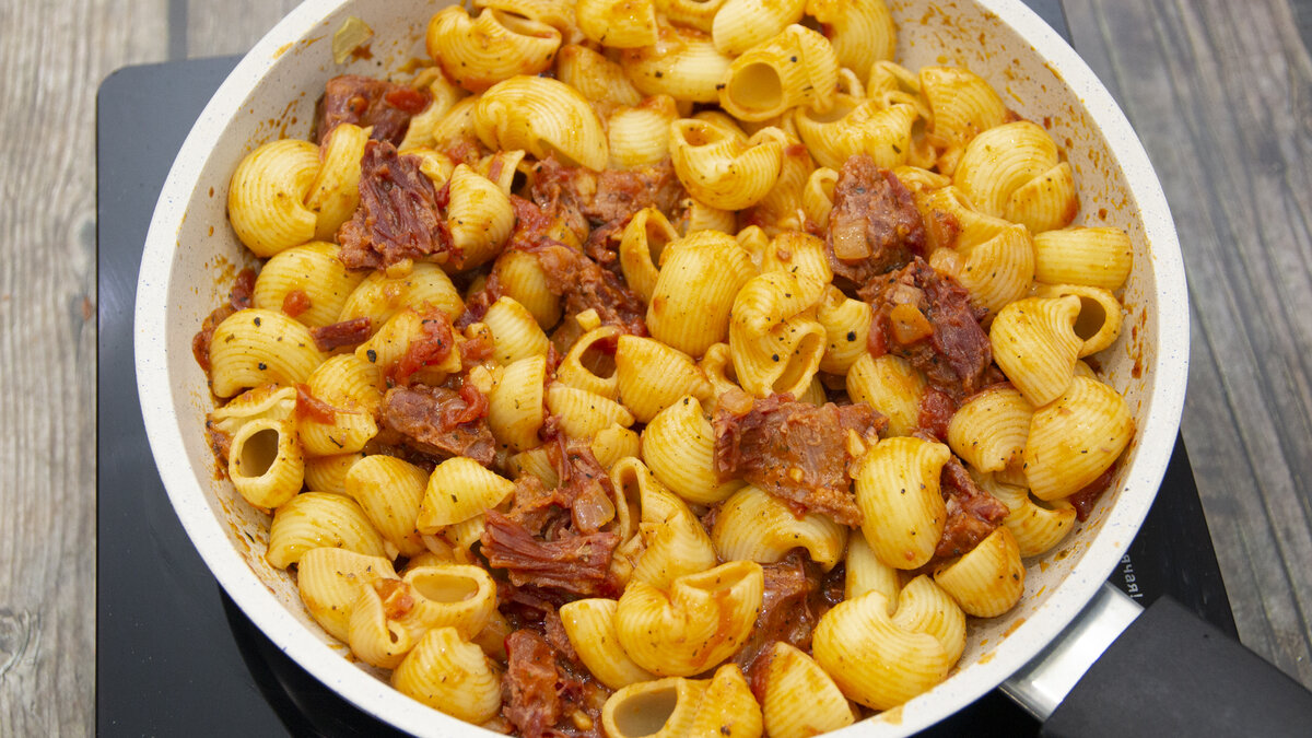 После тушения томатный соус приобретает яркий и насыщенный цвет. Перемешиваем его и не выключая плиту, кладём отваренные макароны. Хорошо перемешиваем и снимаем с огня.