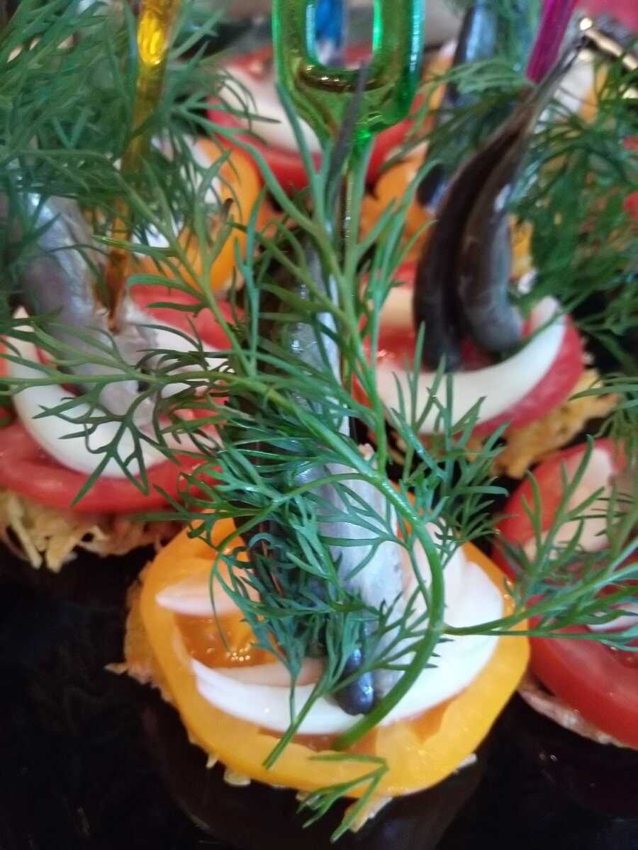 Закуска по-простому: картофельные "рости" с килькой, помидорами и луковыми скобками в виде канапе