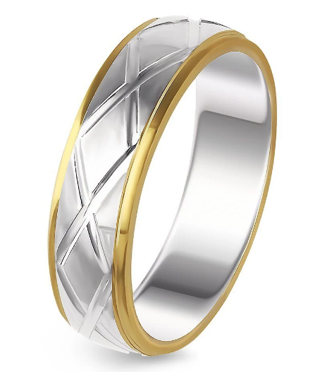 Второй вариант это обручальное кольцо из серебра 925 пробы с красивой узорчатой ресьбой и золотыми вставками по краям. Выглядит очень эффектно! Покрытие тут Золочение+родирование. На него сейчас тоже хорошая скидка, стоит всего 2 317 рублей. На пальце выглядит аккуратно, но заметно.