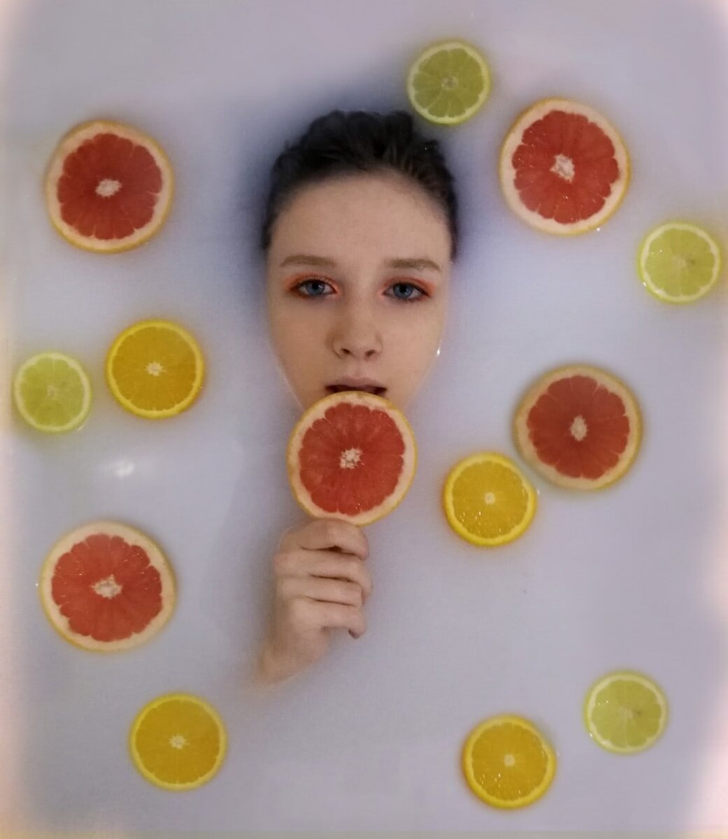 Приятного настроения.. //Чквзау Вторая идея не заставила себя долго ждать. Я так же, как и в прошлый раз, покажу вам еë на собственных снимках. Увы, но не каждый раз я так смогу, ведь у меня есть много нереализованных идей. Некоторые отложены на лучшие время, а другие стоят в очереди на реализацию, но поделится с ними хочется. Могу сказать сразу, что пару из этих идей я "своровал ", но в нашем деле это не преступление. Приступим... Откуда возникла идея для таких фотографий. Всё просто, в интернете большое количество фотографий в молочной ванной, но они в своём большинстве с цветами, чаще всего с розами (пример ниже). Но я подумал что в молочной ванне очень неплохо будут смотреться цитрусы, тем более ими можно прикрыть интимные места для получения необычного кадра... Для проведения подобной фотосесси вам понадобится: В ванную вливаете молоко, и вода преобретает красивый молочный оттенок. Помещаете модель в воду, раскладывате фрукты, порезанные кружочками и даёте волю своему творческо