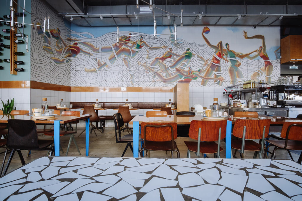 Пельмени с тремя сортами сыра, с курицей и креветками, с крабом, с лисичками и свининой, с лососем — это только малая часть меню кафе “МэниПельмени”в Краснодаре. Пару лет назад дизайнер Надежда Михайленко полностью обновила интерьер заведения, и теперь здесь очень инстаграмное пространство — бетонные стены, яркая мебель в стиле мидсенчури и забавные плакаты со слоганами вроде “Фарш невозможно повернуть назад”. Диваны Надежда разрабатывала, вдохновляясь сиденьями автобусов и автомобилей середины прошлого века, а подстолья круглых столов созданы по прообразу Шуховской башни, которая расположена по соседству.