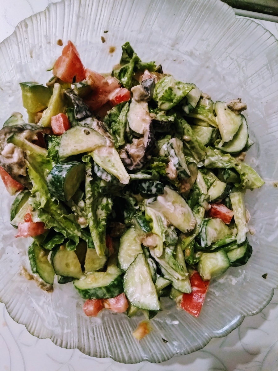 Огурцы и томаты – универсальные ингредиенты для многих летних салатов. Чем их можно разбавить, чтобы получить оригинальный и яркий вкус. Готовы предложить один несложный вариант с нежной заправкой. Как готовим заправку В пиале смешиваем 2 ч. ложек сметаны, добавляем 1 ст. ложку майонеза и наливаем 1 ч. ложку бальзамического уксуса. Тщательно смешиваем ингредиенты, и заправка для салата готова. Для салата потребуются следующие ингредиенты: · 3-4 небольших огурца; · 2-3 томата; · обжаренные со специями (по Вашему усмотрению) и охлажденные кусочки баклажана; · листья салата; · оливковое масло (1 ст. ложка); · соль + черный перец. Порядок действий простой: 1) Промываем и нарезаем овощи. В салатник выкладываем нарезанные томаты и огурцы. 2) Добавляем вымытые листья салата. Если они крупные, то их можно порвать на небольшие кусочки. Добавляем соль, перчим и перемешиваем. 3) Заливаем оливковым маслом, перемешиваем. В заключении заправляем салат заправкой и оставляем на несколько минут в х