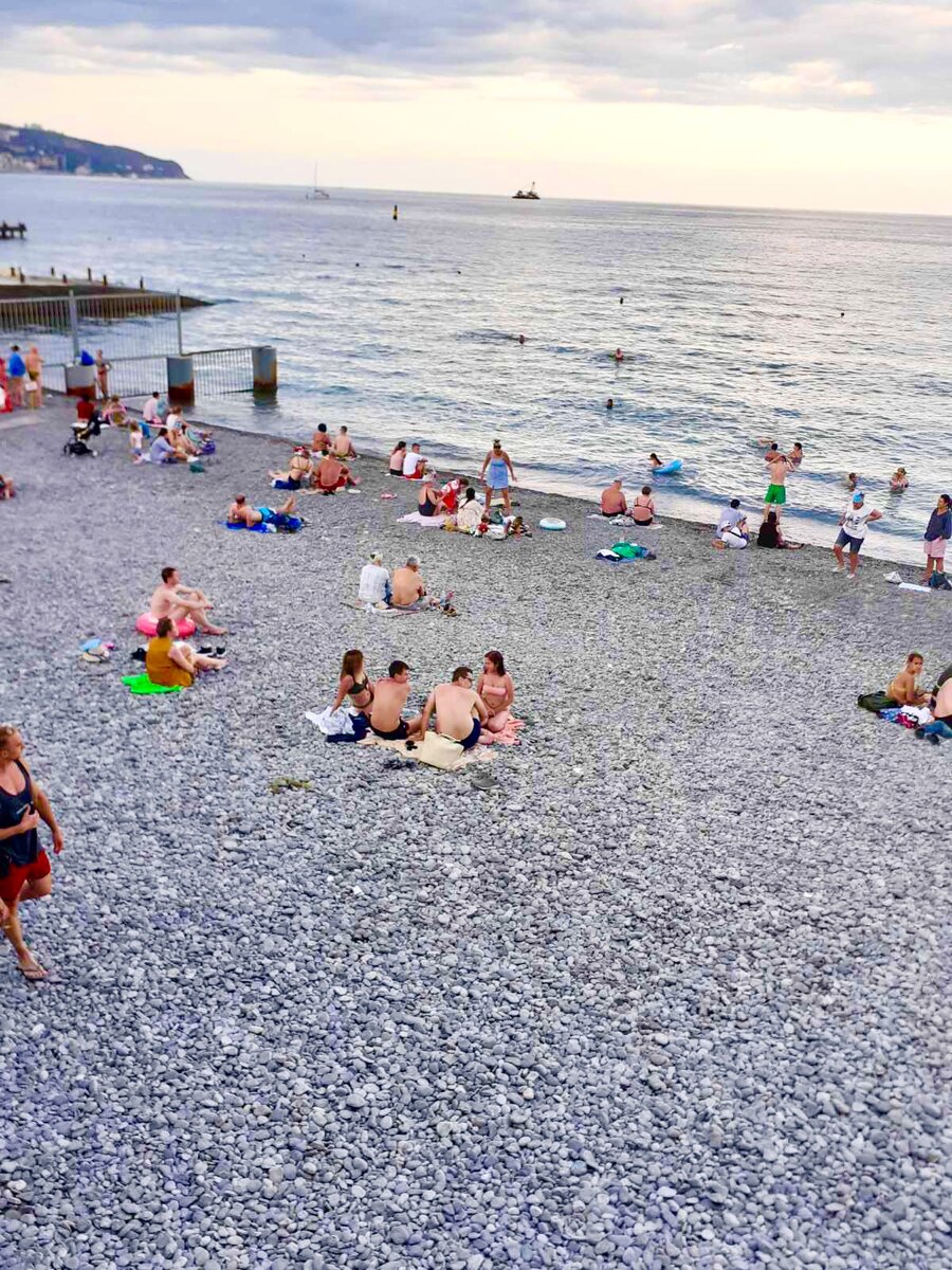 Добрались мы хорошо. Ехали в весёлой дружной компании. Многие , кто с нами был в вагоне, также впервые ехали в Крым. Сказали, что планировали в Турцию или Египет. Но получилось, как получилось. Мы забронировали трёхзвездочный отёль в Ялте, недалеко от центральной набережной. Потом отдельно расскажу за сколько. Приехали поздно вечером, поэтому, что вокруг ничего не видели. Утром, конечно же, первым делом побежали на пляж. Благо, что он совсем рядом с нашим отелем.