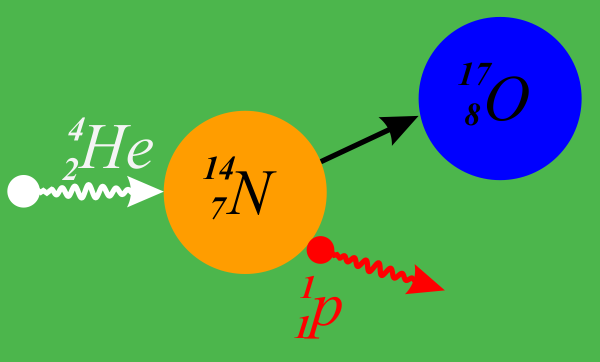 Облучая ядра атомов азота N(7,14) потокам α-частиц, получают изотоп кислорода О(8,17). Какие частицы выделяются одновременно с кислородом в этой реакции? // Ремизов А.Н., Максина А.Г. "Сборник задач по медицинской и биологической физике", 2001 г. https://bookmix.ru/bookprice.phtml?id=84492 Рисунок. Схема описанной в условии задачи реакции.