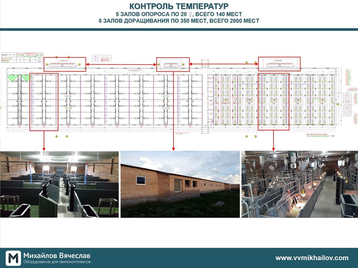 В своей статье "Роль боксов для подготовки воздуха" я уже упоминал об "эффекте погреба" при использовании вентиляции с нижней подачей и нижней вытяжкой воздуха, говорил о том, что подача через подпольное пространство помогает прогреть воздух на 3°С - 5°С зимой, а летом, наоборот - охладить его на те же 3°С - 5°С. Конечно, вы можете поверить мне на слово, но я лично хотел убедиться, что этот аргумент работает и провел собственный эксперимент. Так есть ли "эффект погреба"...? Слайд №1. Точки измерения параметров Контроль температур проводился в здании опороса и доращивания, все параметры залов можно увидеть на Слайде №1. Красным указаны все точки контроля: Слайд №2. Результаты измерений температуры Для чистоты эксперимента, я отключил все пад кулинги. Средняя температура снаружи составила 30,4°С. Температура внутри бокса составила 28,9°С, что уже на 1,5°С ниже. В зале опороса №1 температура на выходе из стойки Экзатоп, фактически приточный клапан, была 26°С, а это уже работает "эффек