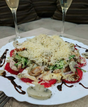 Вот действительно, иногда хочется вкусненького салатика, но теряешься в догадках, какой же салат приготовить))) Выход есть - открываем холодильник и собираем по крупицам все подряд)))))) Салат получился очень вкусным... такой не стыдно и на праздничный стол поставить))) НАДО: - помидоры - 2 шт -курочка - отварная или запеченная -шампиньоны (обжаренные или консервированные) -огурчики свежие - 2 шт -сыр твердый - грамм 50-100 -майонез для заправки (или сметана - пожеланию) -соль, перец, бальзамический соус - по желанию. ДЕЛАЕМ: 1. Помидоры нарезаем кружочками, курочку - ломтиками, шампиньоны - тонкими пластинками. 2. Огурцы натираем на крупной терке, сыр - на мелкой. 3. Собираем салатик слоями. Каждый слой промазываем майонезом. -помидоры выкладываем кружочками и усиленно посыпаем их перцем. -курочка -шампиньоны -половина сыра -тертый огурец -и сверху присыпаем мелко натертым сыром. 4. Украшаем тарелочку грибочками и бальзамическим соусом. И подаем к столу! Приятного вам аппетита!