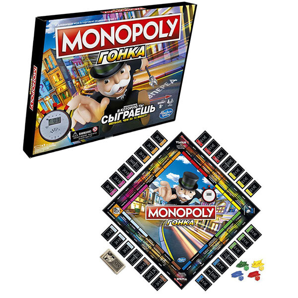 Настольная игра «Монополия. Гонки» предлагает участникам соревноваться на время. В игре всего 4 раунда, в каждом из которых нужно на время покупать, обменивать и продавать недвижимость. Последовательность ходов не учитывается, а игроки совершаются покупки одновременно каждый своими фишками. Можно воспользоваться карточками Шанс для помощи во время продаж и получить бонусы в конце игры с карточками Казна. Кстати, у каждого игрока будет не только своя фишка, но и свой игровой кубик. Hasbro Monopoly Настольная игра Монополия Гонка В наборе: Внимание! Для работы игрушки требуются 3 батарейки ААА.